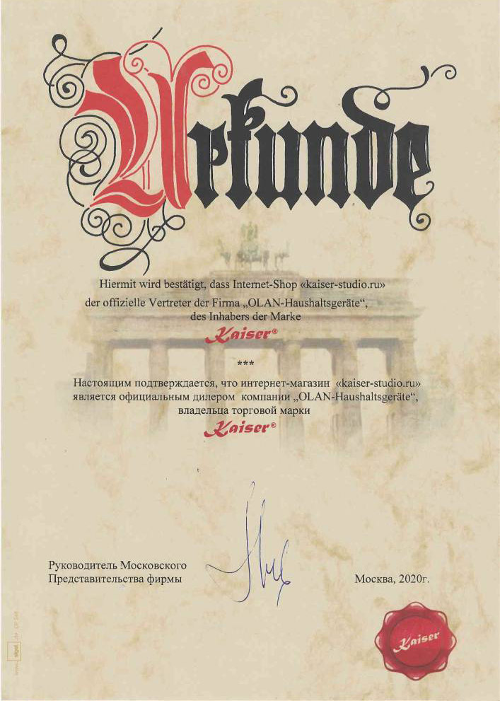 Вся продукция бренда представлена на официальном сайте www.kaiser-olan.de — он на немецком языке и на нем нельзя приобрести понравившуюся модель, только ознакомиться с ассортиментом. Купить технику Кайзер можно через официальных дилеров — одним из которых является наш интернет-магазин kaiser-studio.ru.