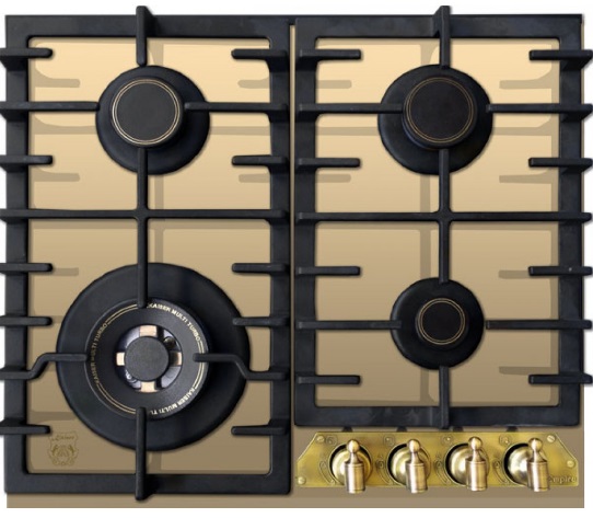KAISER KCG 6335 ElfEm Turbo — это газовая варочная поверхность с механическим управлением. Сама панель управления расположена фронтально, на передней части поверхности справа. Бронзово-золотые переключатели смотрятся очень эффектно в сочетании с основным цветом плиты и черной матовой чугунной решеткой.
