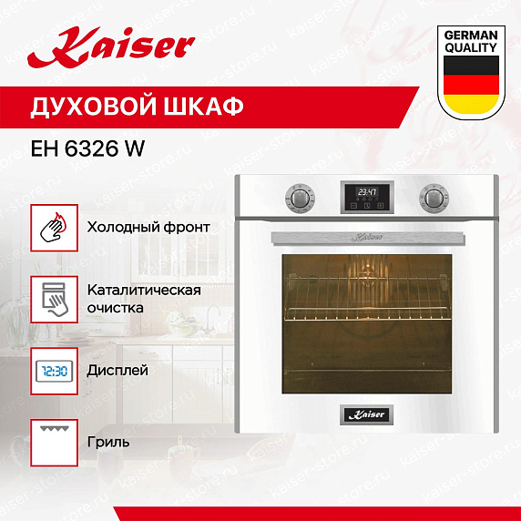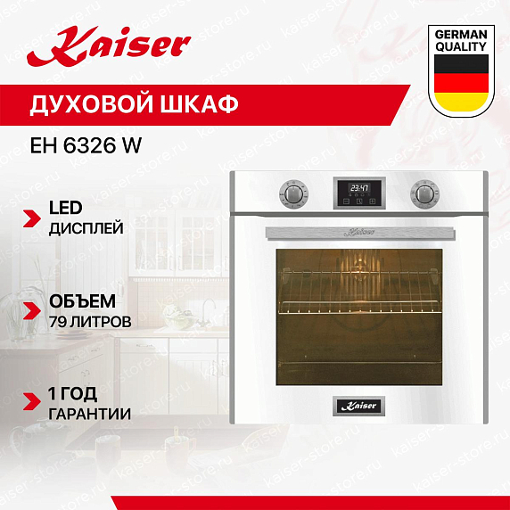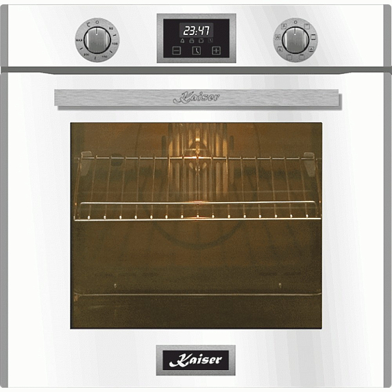 Духовой шкаф KAISER EH 6326 W представлен в белом цвете. С ним Вам станет удобнее и комфортнее готовить свои лучшие блюда, а также попробовать новые рецепты. Стандартны размеры и большой объем внутренней камеры — отличный выбор для тех, кто много готовит. Техника позволяет готовить на нескольких уровнях одновременно, полезный объем составляет 79 л. Такой шкаф будет лаконично смотреться в Вашей кухне. Механическая система управления обеспечивает полный контроль над настройками. Для управления используются поворотные переключатели и сенсорные элементы.