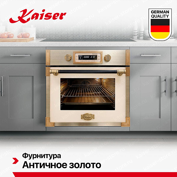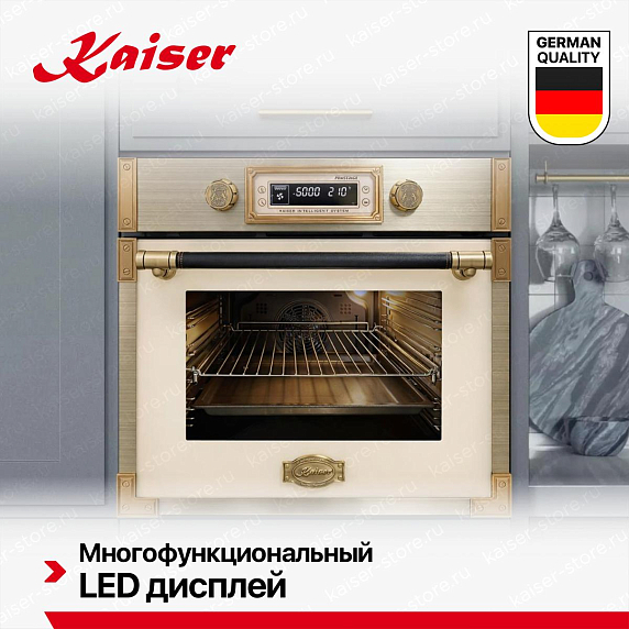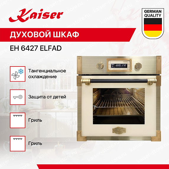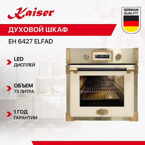 Духовой шкаф Kaiser EH 6427 Elfad — это уникальное сочетание стиля, функциональности и качества. Произведенный в Германии, этот независимый электрический духовой шкаф относится к коллекции Retro и имеет цвет слоновой кости, что придает ему элегантный и классический вид. Фурнитура античного золота и ручка из кожи добавляют изысканный штрих, делая этот шкаф идеальным дополнением к любому интерьеру кухни. Этот духовой шкаф обладает объемом 73 литра и размерами 60×60×55 см, что обеспечивает достаточное пространство для приготовления большого количества блюд одновременно. Внутреннее покрытие из легкоочищающейся эмали и съемная дверца обеспечивают удобство в использовании и уходе.