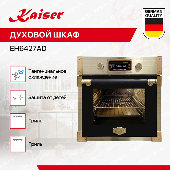 Духовой шкаф Kaiser EH6427AD — это идеальное сочетание стильного дизайна и высокой функциональности. Изготовленный в Германии, этот электрический духовой шкаф обладает габаритами 55×60×60 см, что делает его удобным для встраивания в кухонные ниши размером 60×60×55 см. С его помощью вы сможете создавать кулинарные шедевры, наслаждаясь удобством и комфортом использования. Цвет антрацита придает этому духовому шкафу элегантность и солидность, а цвет фурнитуры — античное золото — добавляет изысканности и шарма. Этот духовой шкаф относится к коллекции Retro, что подчеркивает его уникальный и стильный вид. Фронтальная панель выполнена из эмали, что обеспечивает долговечность и легкость в уходе. Управление этим духовым шкафом осуществляется с помощью вращающихся ручек-джойстиков, что делает его использование простым и удобным. На многофункциональном LED-дисплее отображаются все необходимые параметры работы устройства.