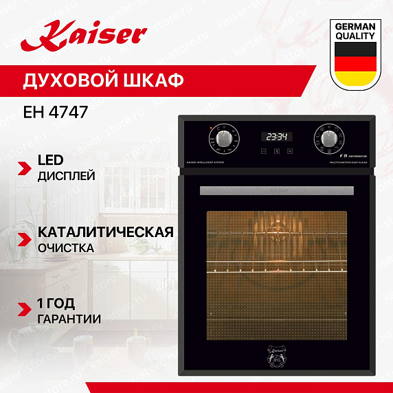 Духовой шкаф оснащен традиционной системой освещения, которое обеспечивает отличную видимость внутри устройства. Объем внутренней камеры составляет 50 литров, что позволяет приготовить достаточное количество еды для большой компании. Устройство предлагает 9 различных функций, включая верхний и нижний нагрев, большой гриль, нижний нагрев с обдувом горячим воздухом и даже функцию размораживания. Все эти функции делают духовой шкаф незаменимым помощником на кухне. Внутреннее покрытие из легкоочищающейся эмали и наличие каталитической очистки обеспечивают легкость в уходе за устройством. Дверца духового шкафа съемная, что упрощает процесс чистки. Духовой шкаф Kaiser EH 4747 оснащен теплоотражающим стеклом THERMO-REFLECTIVE и тангенциальным охлаждением, что обеспечивает безопасность использования и продлевает срок службы устройства.