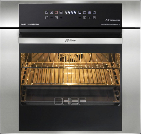 Многофункциональный электрический духовой шкаф Kaiser EH 6926 оснащен сенсорным управлением Full Touch и системой Multi 9 с девятью программами нагрева. Модель входит в линейку CHEF, фронтальная поверхность из стекла с ручкой из нержавеющей стали имеет покрытие против отпечатков пальцев. Это первая духовка с внутренней камерой, покрытой эмалью без применения никеля, что делает производство покрытия более экологичным. Прибор оснащен удобными хромированными лестничками для установки противней и съемной дверцей для упрощения очистки.
