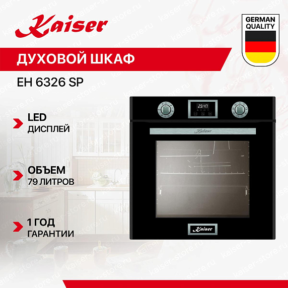 Независимый электрический духовой шкаф KAISER EH 6326 SP оформлен в черном цвете с элементами серебра, для приготовления пищи в нём используются современные технологии. Благодаря большому внутреннему объему в 79 л, вы сможете готовить несколько блюд одновременно на разных уровнях.