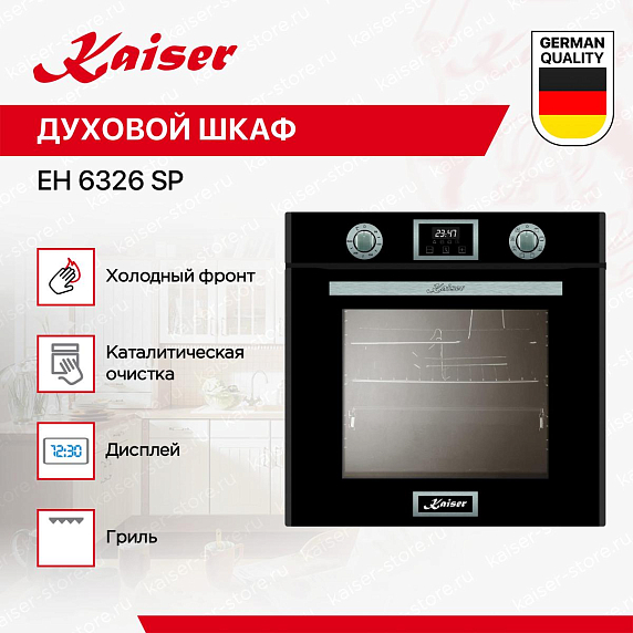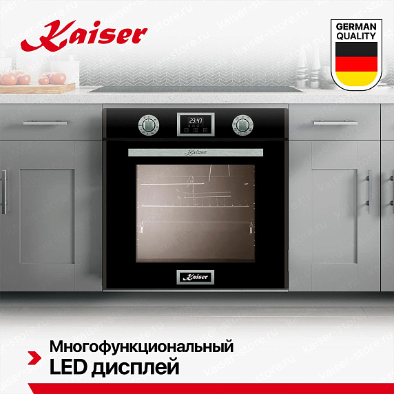 Комфортному управлению духового шкафа KAISER EH 6326 SP способствует поворотный механизм, сенсорные переключатели, а также дисплей, на котором отображаются сведения о состоянии устройства. С его помощью вы можете легко включать/выключать и менять настройки легким касанием руки. Это обеспечивает точность, поскольку чувствительные датчики улавливают едва заметные перемещения пальцев. LED-дисплей способен отображать информацию в цифровом, буквенном виде, в символьном, и в графическом.