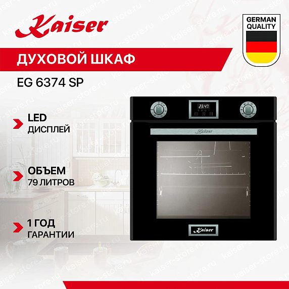 Электронное управление духового шкафа KAISER EG 6374 SP включает в себя два утапливаемых и сенсорные переключатели. Такой тип управления — это не только достижение результата легким касанием руки, но и надежность, т.к. сенсорные панели укрывают электронику от внешних загрязнений, а также точность настроек, поскольку чувствительные датчики улавливают едва заметные перемещения пальцев. Дисплей, которым оснащена современная духовка Кайзер, способен отображать информацию не только в цифровом или буквенном виде, но и в символьном, и в графическом.