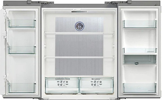 Устройство обладает высотой 183 см, шириной 83.6 см и глубиной 70.6 см, обеспечивая общий объем 506 литров. Это двухкамерный холодильник типа Side-by-side с расположением морозильной камеры снизу. Объем холодильной камеры составляет 323 литра, а морозильной — 183 литра. Инновационная система охлаждения NoFrost в обеих камерах предотвращает образование инея и льда, а также обеспечивает равномерное распределение температуры. Размораживание происходит автоматически, что значительно облегчает уход за устройством. Управление холодильником осуществляется электронной системой Intelligent system с дисплеем. Вы можете выбрать один из четырех режимов работы, а также воспользоваться функциями суперохлаждения и суперзаморозки.Внутреннее светодиодное освещение обеспечивает яркое и равномерное освещение, делая использование холодильника удобным и комфортным. Индикация открытой дверцы подает звуковой сигнал, что помогает избежать ненужного расхода энергии. Холодильник оснащен ледогенератором, полками, контейнерами Garden Box Vitamin и лотком для яиц. Все это делает его вместительным и функциональным.Класс энергопотребления E (старое обозначение — A++) говорит о его энергоэффективности. Уровень шума составляет всего 41 дБ, что делает его практически бесшумным.
