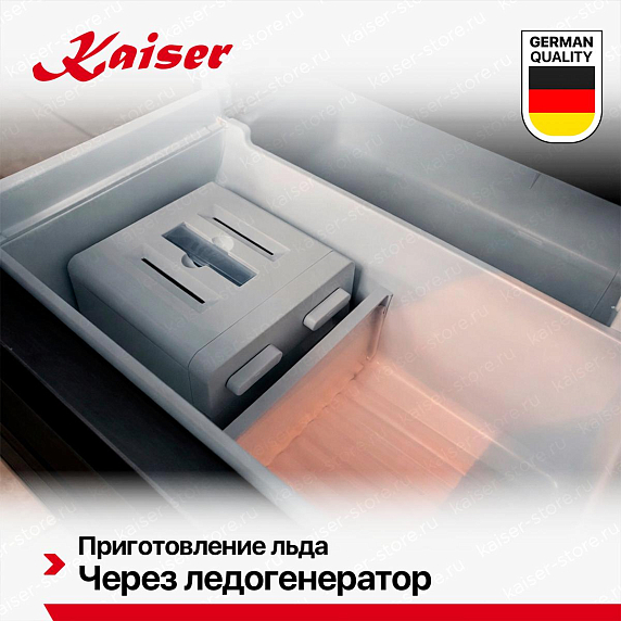 Система NoFrost в морозильном отделении холодильников Kaiser предотвращает образование инея и наледи за счёт циркуляции сухого холодного воздуха и автоматической оттайки испарителя. Благодаря этому продукты не смерзаются, а внутреннее пространство остаётся всегда чистым — ручная разморозка не требуется. Система обеспечивает стабильную температуру, быструю заморозку и равномерное распределение холода по всем ящикам.
