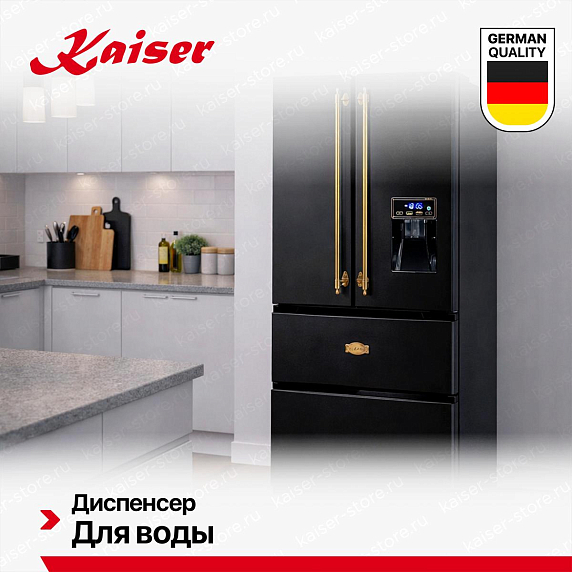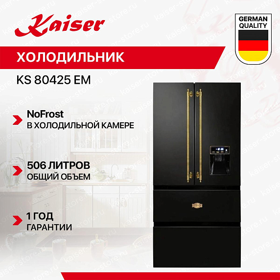 Холодильник Kaiser KS-80425 EM — это гармония стиля и функциональности, разработанный в Германии и украшенный впечатляющим черным дизайном с золотой фурнитурой. С его окрашенной стальной фронтовой частью и накладными ручками, он воплощает эстетику коллекции Modern и дизайна Empire, обеспечивая в то же время высокую производительность и надежность. Особенности этого отдельностоящего холодильника Side-by-side включают в себя двухкамерную конструкцию с морозильной камерой снизу. Его размеры составляют 183 см в высоту, 83.6 см в ширину и 70.6 см в глубину, обеспечивая общий объем в 506 литров. Внутреннее светодиодное освещение обеспечивает четкое и яркое освещение, делая содержимое легко видимым.