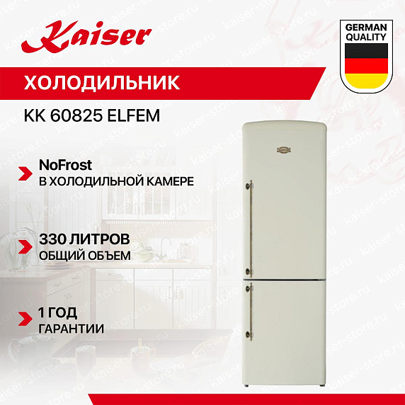 Холодильник Kaiser KK 60825 ElfEm — это уникальное сочетание стиля, функциональности и надежности. Эта модель, выпущенная в Германии, выделяется своим дизайном в стиле Empire, который выполнен в цвете "Слоновая кость" и подчеркивается бронзовой фурнитурой. Ручки накладного типа добавляют особый шарм и удобство в использовании.