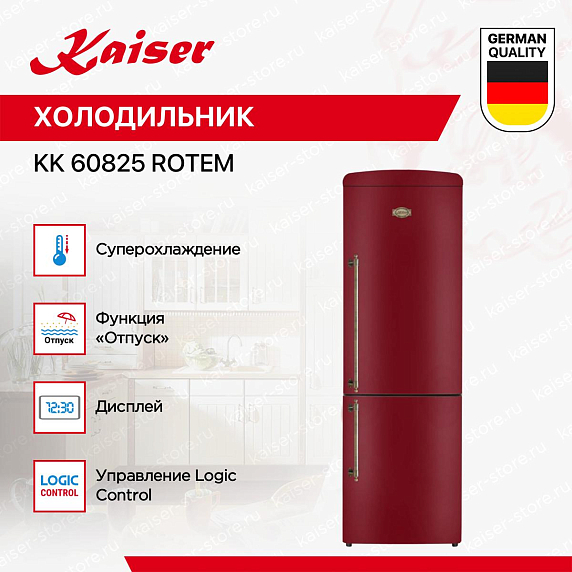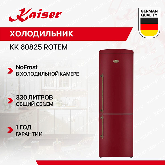 Холодильник Kaiser KK 60825 Rotem — это уникальное сочетание стиля, функциональности и надежности. Эта модель, выпущенная в Германии, выделяется своим дизайном в стиле Empire, который подчеркивается бордовым цветом корпуса и бронзовой фурнитурой. Ручки накладного типа добавляют особый шарм и удобство в использовании.