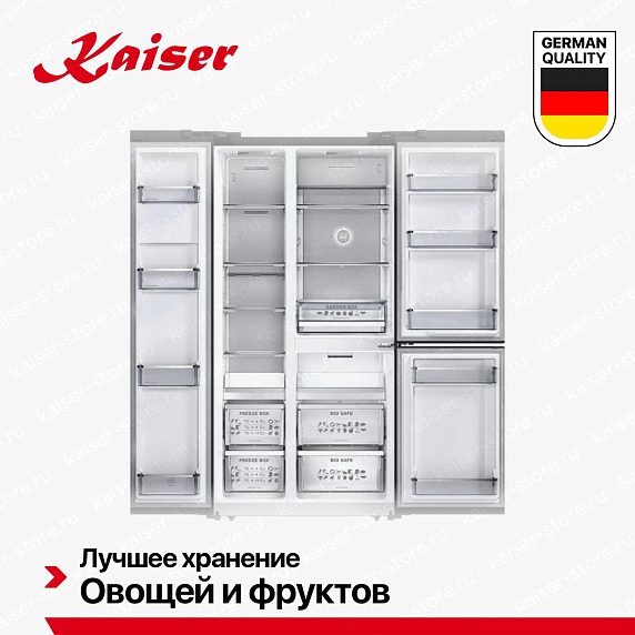 Система NoFrost в морозильном отделении холодильников Kaiser предотвращает образование инея и наледи за счёт циркуляции сухого холодного воздуха и автоматической оттайки испарителя. Благодаря этому продукты не смерзаются, а внутреннее пространство остаётся всегда чистым — ручная разморозка не требуется. Система обеспечивает стабильную температуру, быструю заморозку и равномерное распределение холода по всем ящикам.