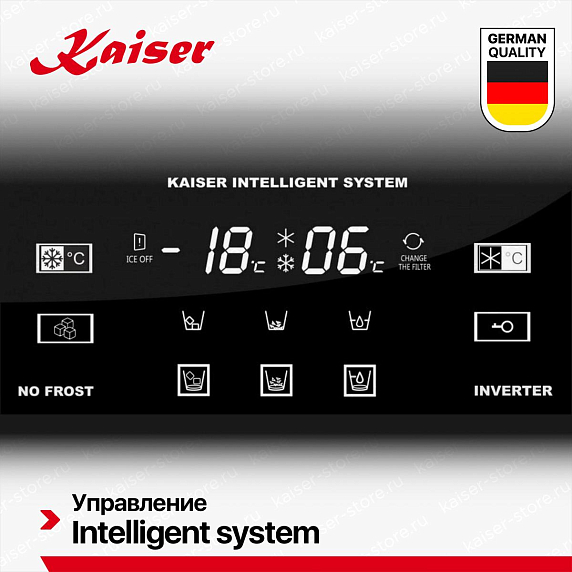 Система NoFrost в морозильном отделении холодильников Kaiser предотвращает образование инея и наледи за счёт циркуляции сухого холодного воздуха и автоматической оттайки испарителя. Благодаря этому продукты не смерзаются, а внутреннее пространство остаётся всегда чистым — ручная разморозка не требуется. Система обеспечивает стабильную температуру, быструю заморозку и равномерное распределение холода по всем ящикам.