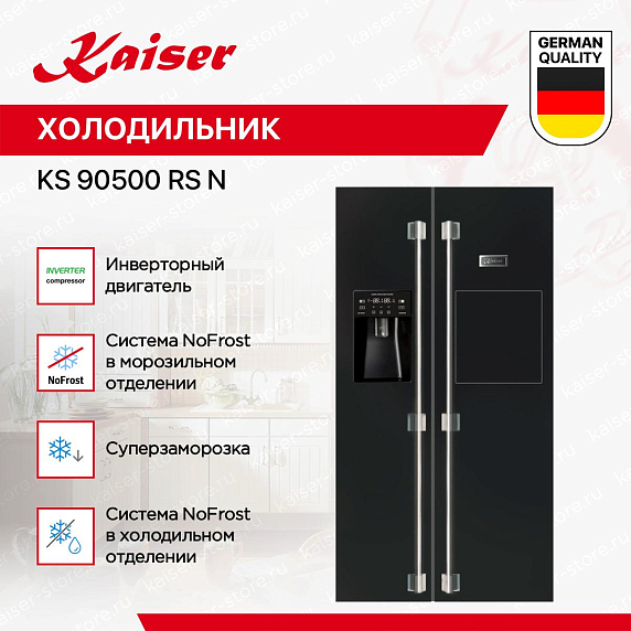 Холодильник Kaiser KS 90500 RS N — это воплощение современного стиля и функциональности, идеально подходящее для любой кухни. Этот отдельностоящий двухкамерный холодильник Side-by-side с элегантным черным цветом и фронтом из окрашенной стали и накладными ручками, что придает ему изысканный внешний вид.