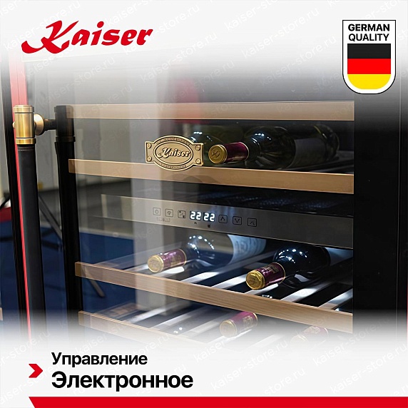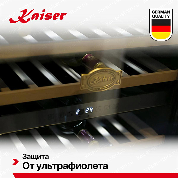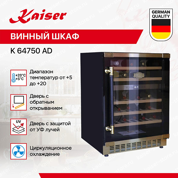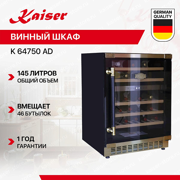 Винный шкаф Kaiser K 64750 AD имеет две температурные зоны, в которых одновременно можно хранить разные сорта алкоголя и выставлять разные сочетания настроек. Он устанавливается отдельно, что удобно, если у вас есть специальное помещение — кладовая, погреб и т.д. Благодаря компактным размерам данная модель — отличный выбор для офиса, гостиничного номера. Количество бутылок, которое можно разместить с учетом полной комплектации и из расчета объема бутылки 0,75 л, — 46 шт.