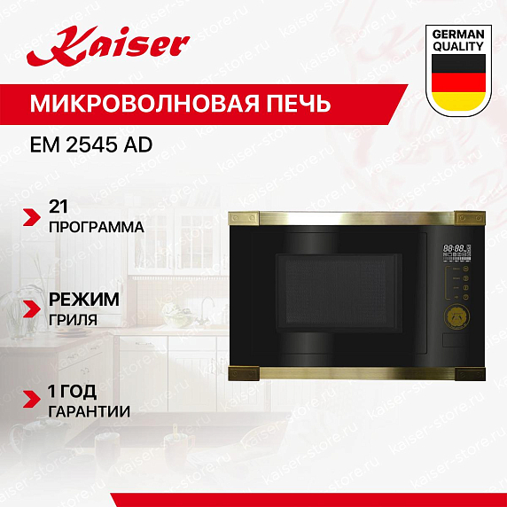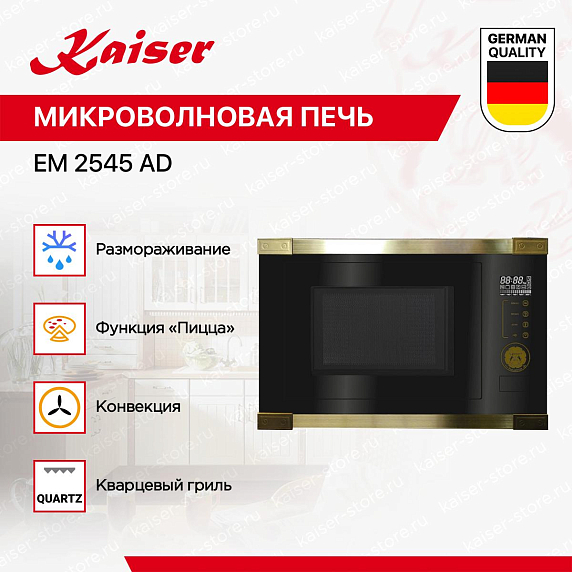 Встраиваемая микроволновая печь Kaiser EM 2545 AD выполнена в черном цвете с золотой окантовкой. Дверца модели навесная, открывается при помощи специальной кнопки. Ее объем составляет 25 л, модель может похвастаться наличием 16 автоматических программ, позволяющих реализовать любую кулинарную идею. Внутри основной камеры предусмотрено покрытие из эмалированной стали, которое с легкостью очищается от множества загрязнений.