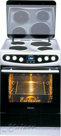 Плита электрическая блинная с четырьмя конфорками и электронным программатором работы. Оснащена электрической духовкой с инфракрасным грилем и электрическим вращающимся вертелом, а также посудным легко-выдвигающимся ящиком со стеклянным фронтом.