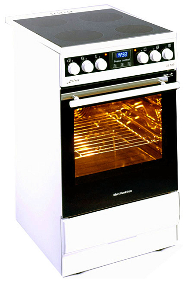 Плита электрическая с четырьмя стеклокерамическими конфорками и электронным программатором работы. Оснащена нагревательными электродами сверхбыстрого нагрева Hi-Light, электрической духовкой Multi 5 с термоциркуляцией и функцией размораживания.
