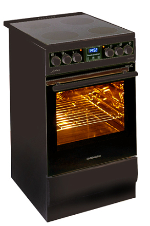 Плита электрическая с четырьмя стеклокерамическими конфорками и электронным программатором работы. Оснащена нагревательными электродами сверхбыстрого нагрева Hi-Light, электрической духовкой Multi 9 с термоциркуляцией, инфракрасным грилем и функцией размораживания, а также посудным легко-выдвигающимся ящиком.