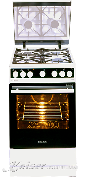 Плита газовая с четырьмя конфорками, белого цвета. Оснащена поворотными ручками с электроподжигом, газовой духовкой с инфракрасным грилем, функцией предохранения от утечки газа и электрическим вращающимся вертелом, а также посудным легко-выдвигающимся ящиком.