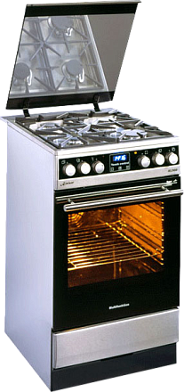 Газо-электрическая плита из нержавеющей стали с четырьмя газовыми конфорками и электрической духовкой Multi 9. Оснащена термоциркуляцией, инфракрасным грилем и функцией размораживания.