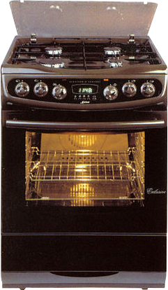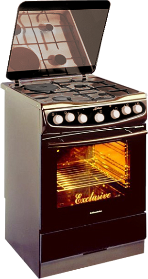 Плита газо-электрическая коричневого цвета с тремя газовыми и одной электрической конфорками. Класс энергопотребления Super A+. В оснащение электрической духовки входит инфракрасный гриль и электрический вращающийся вертел.