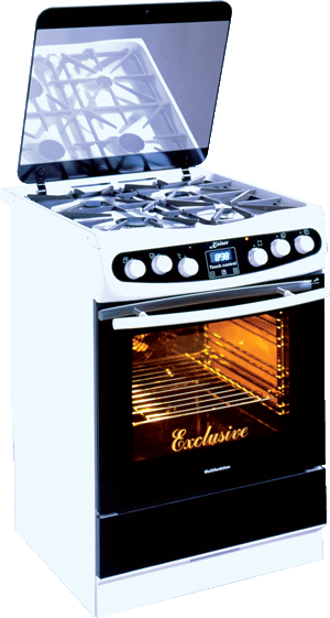 Газо-электрическая плита белого цвета с четырьмя газовыми конфорками и электронным программирующим устройством Touch Control. Духовка Multi 9 оснащена термоциркуляцией, инфракрасным грилем и функцией размораживания.