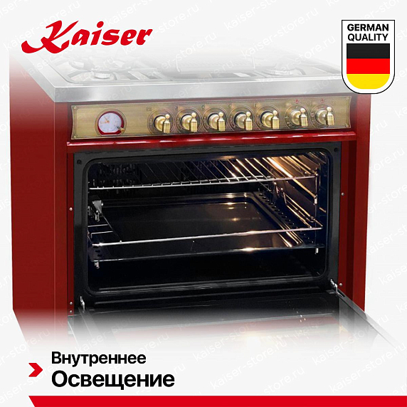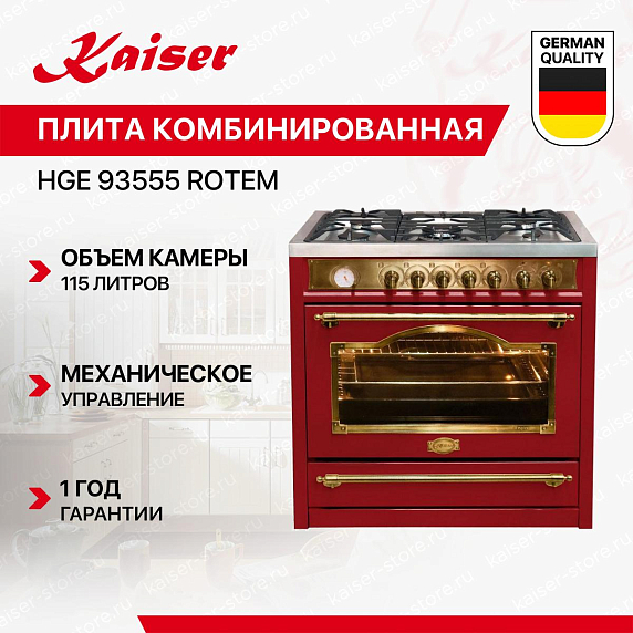 Плита комбинированная Kaiser HGE 93555 RotEm представлена в элегантном красном цвете и станет изюминкой вашей кухни. Модель относится к коллекции Empire, фурнитура выполнена в стиле Ампир и представляет настоящее произведение искусства. Механическое управление осуществляется с помощью металлических поворотных переключателей. Оно интуитивно понятное и одновременно надежное. Цифровой дисплей отображает всю необходимую информацию. Встроенный таймер своевременно оповестит о завершении работы. Варочная панель имеет пять конфорок, одна из которых WOK. Материал поверхности нержавеющая сталь устойчив к механическим воздействиям и влиянию высоких температур. Благодаря электроподжигу зажечь горелки не составляет никакого труда, необходимо лишь повернуть программатор и огонь загорится. Полезный объем духовки составляет 115 л, этого достаточно для будничной готовки и праздничных обедов. Дверца имеет тройное остекление, которое не допускает получение ожога по неосторожности, а также, за счет отсутствия потерь тепла духовым шкафом, снижает затраты электроэнергии. Съемные направляющие с возможностью мытья в посудомоечной машине и эмаль легкой очистки облегчают уход за прибором. В стандартной комплектации предусмотрены: решетка для духовки, чугунный WOK-адаптер, ящик для посуды и вертел. Гарантия от производителя составляет один год.