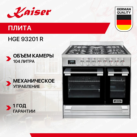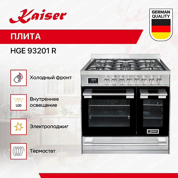 Комбинированная плита Kaiser HGE 93201 R — это пример того, как современные технологии и стильный дизайн могут сочетаться в одном устройстве. С первого взгляда на эту модель, вас поразит ее эстетическая привлекательность. Покрытие из нержавеющей стали придает ей современный и элегантный вид, который будет гармонично смотреться в любом интерьере кухни.
