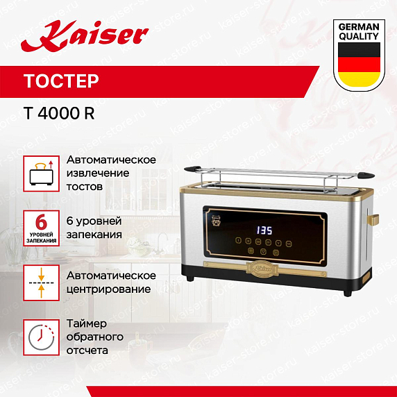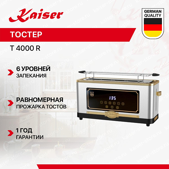 Тостер Kaiser T 4000 R создан для тех, кто ценит форму прошлых эпох и возможности современной электроники. Корпус выполнен в корпусном решении коллекции Retro из нержавеющей стали, которое сочетает матовый блеск с аккуратными хромированными вставками. Компактные габариты 18.5 x 38.5 x 13.1 см позволяют разместить прибор даже на небольшой столешнице, а масса всего 1.9 кг упрощает перестановку. Сенсорная панель управления с LED-подсветкой и встроенным дисплеем делает эксплуатацию интуитивной: выбирайте один из шести уровней поджаривания, активируйте одну из трёх программ, воспользуйтесь функцией разморозки или быстрого подогрева. Продуманная внутренняя геометрия обеспечивает автоматическое центрирование ломтиков для равномерного результата, а механизм автоматического извлечения подаёт готовые тосты сверху, предотвращая пригорание. Съёмный поддон из нержавеющей стали собирает крошки и позволяет легко поддерживать чистоту, не требуя специальных средств. Длина питающего кабеля 0.7 м и возможность.