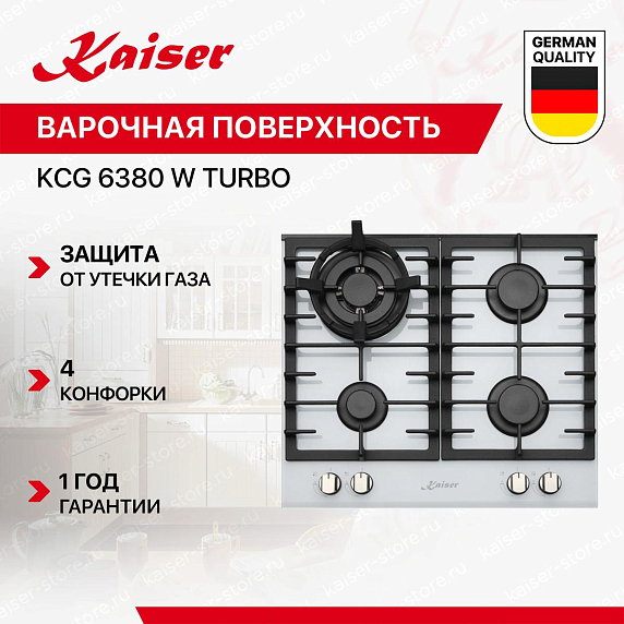 Среди дополнительных преимуществ варочной панели Кайзер KCG 6380 W Turbo следует назвать электропождиг и газ-контроль, которые предусмотрены в системе безопасности кухонного оборудования. Это удобно и безопасно. Первая функция обеспечивается быстрым и безопасным розжигом ё от электрической искры, она избавляет вас от необходимости зажигать конфорку самостоятельно, что делает использование более удобным. Вторая перекрывает подачу газа, если пламя случайно гаснет, что исключает возможность утечки.
