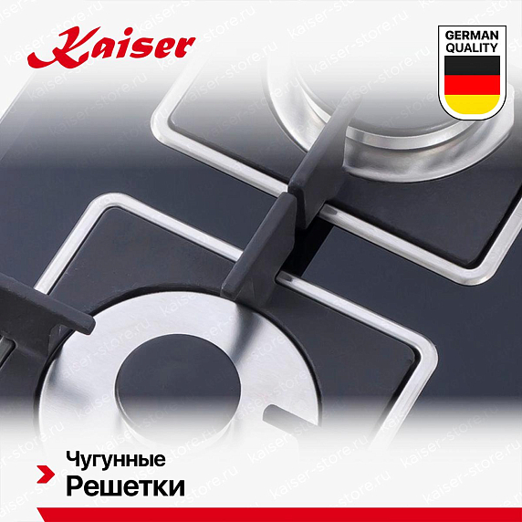 Газовые варочные панели Kaiser — это надёжность, точный контроль пламени и классическая технология готовки. Изготовлены из закалённого стекла или нержавеющей стали, оснащены чугунными решётками, автоматическим электроподжигом и системой газ-контроль (автоматическое отключение при затухании пламени). Конфорки разной мощности — от мощной для быстрого кипячения до экономичной для томления — обеспечивают гибкость в приготовлении. Подходят для любой посуды, работают даже при отключении электричества.
