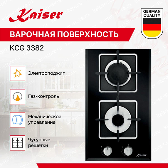 Выбор данной варочной панели Кайзер KCG 3382 чаще всего обусловлен тем, что в частный дом или квартиру проведен именно газ в качестве обогрева. Это оборудование абсолютно безопасно, так как оно обладает тщательно продуманной системой защиты. Благодаря специальным датчику и клапану при случайном угасании огня газ мгновенно блокируется и перестает поступать — утечка предотвращена. Функция электроподжига избавляет Вас от опасности обжечься, слишком близко протянув руку к конфорке. Пламя загорается простым поворотом переключателя, без использования спичек и зажигалок, что гарантирует безопасную и комфортную эксплуатацию.