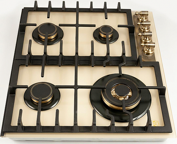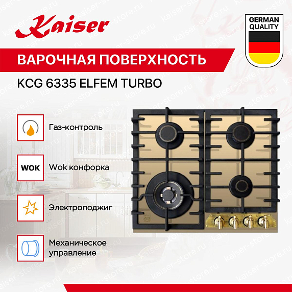 Независимая газовая поверхность Kaiser KCG 6335 Elfem Turbo — это высококачественная бытовая техника, произведенная в Германии. Этот продукт отличается своим неповторимым дизайном в стиле Retro, который подчеркивает его элегантность и привлекательность. Цвет слоновой кости, дополненный бронзовой фурнитурой, придает устройству особую изысканность и шарм. Стильная и функциональная поверхность выполнена из закаленного стекла, что обеспечивает ее долговечность и устойчивость к повреждениям. Обработка края скошенным краем спереди придает изделию завершенный вид, а чугунная решетка обеспечивает надежную поддержку для посуды во время приготовления пищи.