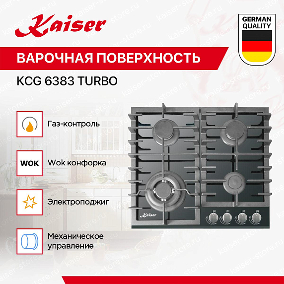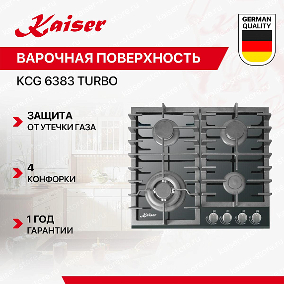 Газовая варочная поверхность KAISER KCG 6383 TURBO выполнена из закаленного стекла. Панель имеет современный внешний вид и будет стильно смотреться на вашей кухне с любым дизайном.
