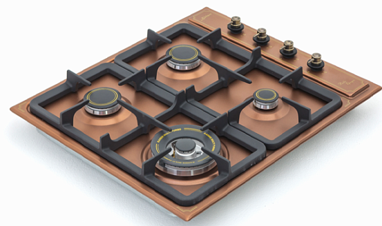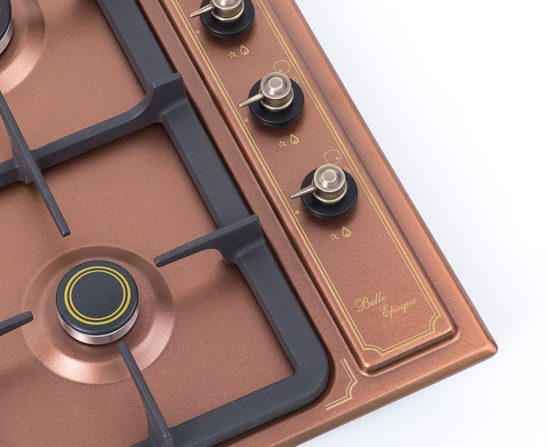 Варочная панель KG 6976 CuGBE Turbo выполненная в винтажном стиле. Панель оснащена элегантными поворотными переключателями Gold с автоматическим электроподжигом конфорок. Тройная турбо-конфорка обеспечивает максимально мощный и быстрый нагрев. За безопасность эксплуатации отвечает система газ-контроль.