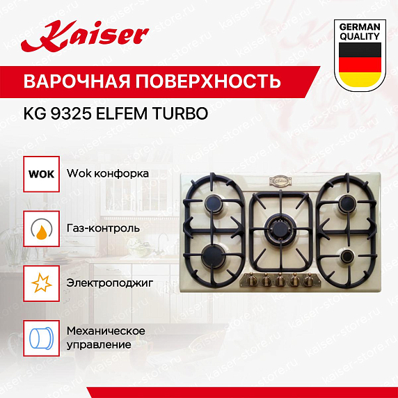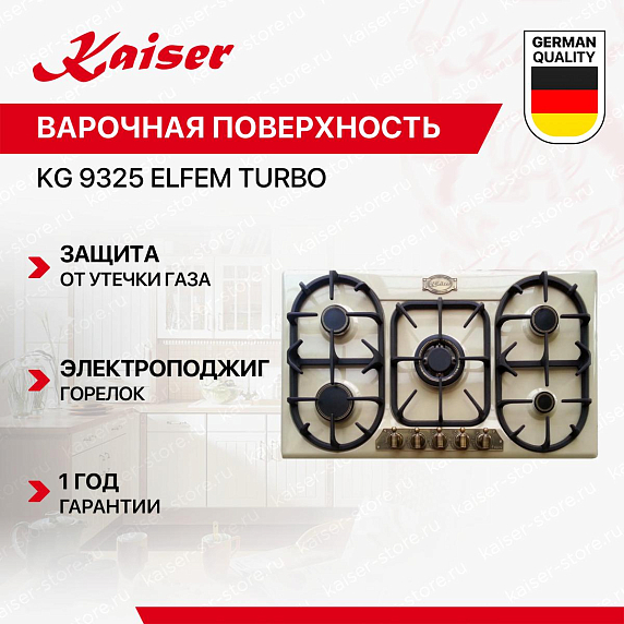 Газовая варочная поверхность KAISER KG 9325 ELFEM TURBO выполнена в цвете «Слоновая кость». Она имеет современный внешний вид, поэтому будет стильно смотреться на вашей кухне с любым дизайном. Открытый огонь не страшен ни вам, ни вашей посуде благодаря надёжным решёткам.