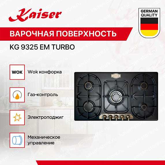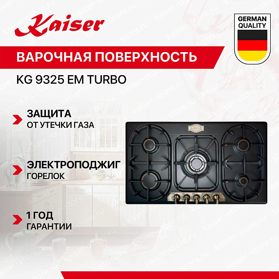 Варочная панель Kaiser KG 9325 Em Turbo выглядит очень современно и даже слегка агрессивно, подчеркивая Вашу индивидуальность. Она имеет вид ретро. Сама панель в черном цвете с бронзовыми поворотными переключателями. Конфорки окружены в такую геометрию, которые делают поверхность особенной и интересной.