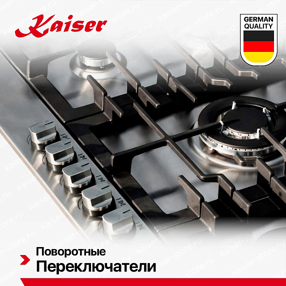 Ключевые преимущества:Газовые варочные панели Kaiser — это надёжность, точный контроль пламени и классическая технология готовки. Изготовлены из закалённого стекла или нержавеющей стали, оснащены чугунными решётками, автоматическим электроподжигом и системой газ-контроль (автоматическое отключение при затухании пламени). Конфорки разной мощности — от мощной для быстрого кипячения до экономичной для томления — обеспечивают гибкость в приготовлении. Подходят для любой посуды, работают даже при отключении электричества.