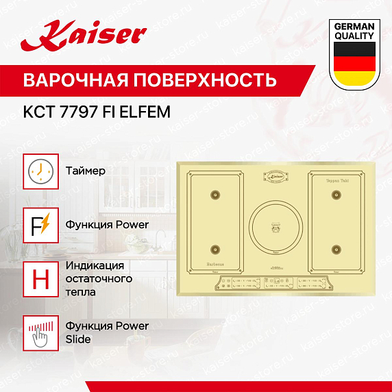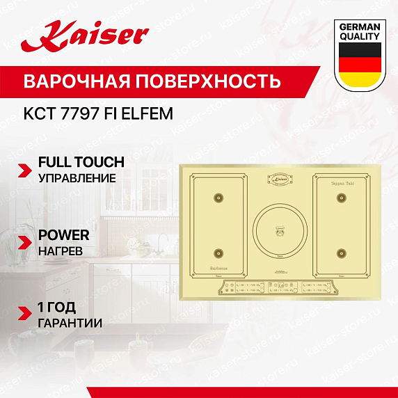 Независимая индукционная поверхность Kaiser KCT 7797 FI Elfem — это высококачественное изделие от немецкого производителя, которое сочетает в себе стиль и функциональность. Модель выполнена в цвете слоновой кости, что придает ей изысканный и элегантный вид. Частью коллекции Retro, она способна внести в ваш интерьер нотки классического стиля. Устройство имеет ширину 77 см, глубину 52 см и высоту 6.2 см, что делает его достаточно компактным и удобным для размещения на любой кухне. Габариты ниши для встраивания составляют 74 на 49 см, что обеспечивает легкий монтаж в столешницы из любых материалов. Поверхность плиты изготовлена из ударопрочной стеклокерамики с износостойкой графикой SCHOTT CERAN. Этот материал отличается высокой прочностью и долговечностью, а также легкостью в уходе. Скошенные края придают модели завершенный и стильный вид.