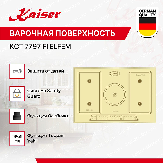 Функция Teppan Yaki в варочных панелях Kaiser имитирует японскую технологию приготовления на гладкой металлической плите. В индукционных и Hi-Light моделях выделяется большая прямоугольная зона нагрева, идеально подходящая для приготовления мяса, рыбы, овощей и блюд «всё в одном». Благодаря равномерному распределению тепла продукты готовятся быстро, сочно и без масла. Подходит для использования специальных сковородок-гриль или чугунных плит.