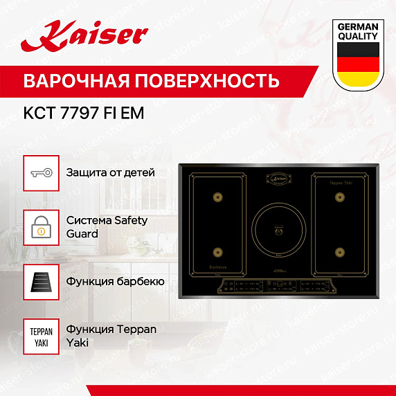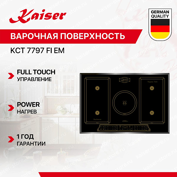 Варочная панель Kaiser KCT 7797 FI EM имеет черный цвет. Материал самой поверхности — это ударопрочная керамика с износостойкой графикой. Управление этой моделью электронное, для переключения уровней нагрева, выбора функций используются TouchSlider — сенсорные переключатели. Продвинутая система контроля за прибором делают его современным и отвечающим на главные запросы покупателя.