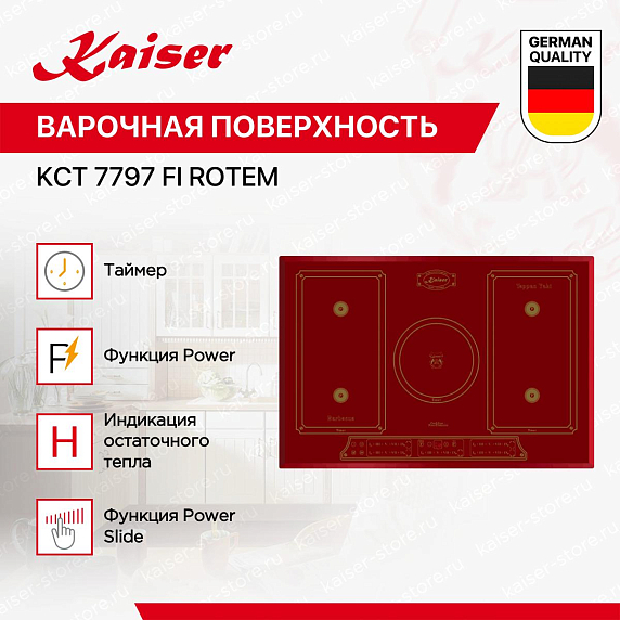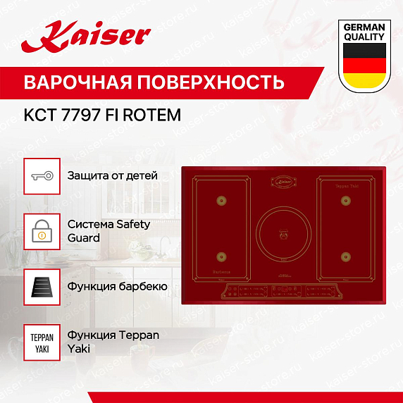 Варочная панель Kaiser KCT 7797 FI RotEm выполнена в красном цвете из стеклокерамики. Такой материал устойчив к температурному воздействию. Она имеет 5 зон нагрева для вашего удобного использования. При этом имеется возможность объединения зон нагрева. Модель будет удобна для встраивания, ее размеры составляют: высота — 6,2 см, ширина — 77 см, глубина — 52 см.