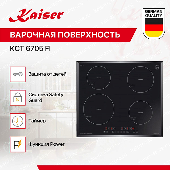 Независимая варочная поверхность Kaiser KCT 6705 FI — это не только функциональный, но и стильный элемент вашей кухни. Произведенная в Германии, эта варочная панель сочетает в себе надежность и продуманный дизайн. Черный цвет и скошенные края придают ей современный и элегантный вид, который идеально впишется в любой интерьер. Поверхность панели изготовлена из ударопрочной стеклокерамики с износостойкой графикой SCHOTT CERAN, что обеспечивает ей долгий срок службы. Этот материал не только прочный, но и легко очищается от грязи и жира, что значительно упрощает процесс уборки. Управление варочной панелью осуществляется с помощью сенсорного Touch Control. Это удобно и практично, так как позволяет быстро и точно регулировать температуру нагрева. Кроме того, на панели есть индикатор остаточного тепла, который предупреждает о том, что поверхность еще горячая.