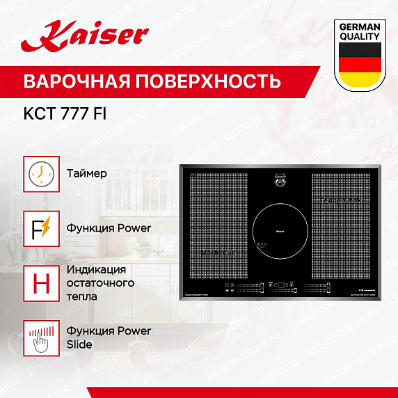 Индукционные варочные панели Kaiser обеспечивают быстрый, точный и безопасный нагрев — тепло генерируется непосредственно в посуде, а поверхность остаётся относительно прохладной. Многие модели оснащены сенсорным управлением, функциями «Быстрый нагрев», «Поддержание тепла», таймером и блокировкой от детей. Работают только с посудой из ферромагнитных материалов, но при этом экономят до 30% энергии. Благодаря закалённому стеклу легко чистятся и гармонично вписываются в современный интерьер.