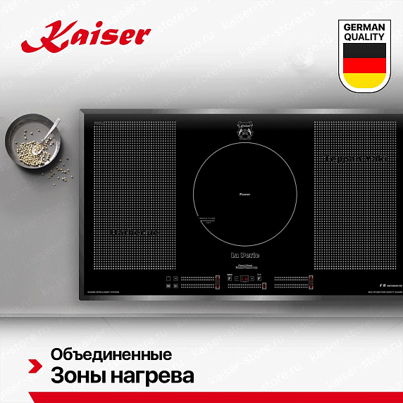 Функция Teppan Yaki в варочных панелях Kaiser имитирует японскую технологию приготовления на гладкой металлической плите. В индукционных и Hi-Light моделях выделяется большая прямоугольная зона нагрева, идеально подходящая для приготовления мяса, рыбы, овощей и блюд «всё в одном». Благодаря равномерному распределению тепла продукты готовятся быстро, сочно и без масла. Подходит для использования специальных сковородок-гриль или чугунных плит.