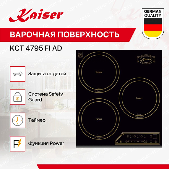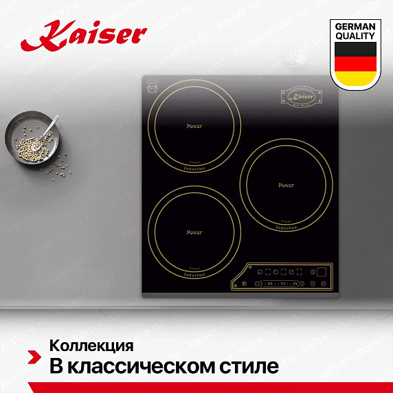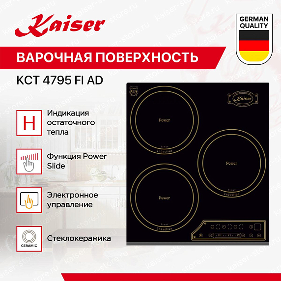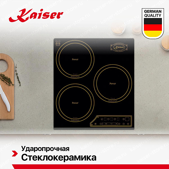 Индукционные варочные панели Kaiser обеспечивают быстрый, точный и безопасный нагрев — тепло генерируется непосредственно в посуде, а поверхность остаётся относительно прохладной. Многие модели оснащены сенсорным управлением, функциями «Быстрый нагрев», «Поддержание тепла», таймером и блокировкой от детей. Работают только с посудой из ферромагнитных материалов, но при этом экономят до 30% энергии. Благодаря закалённому стеклу легко чистятся и гармонично вписываются в современный интерьер.