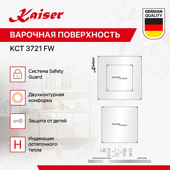 При помощи таймера вам больше не потребуется контролировать ход кулинарного процесса, ведь по его окончанию конфорка варочной панели Кайзер KCT 3721 FW отключится самостоятельно.