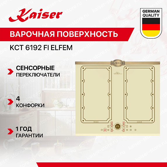 Индукционные варочные панели Kaiser обеспечивают быстрый, точный и безопасный нагрев — тепло генерируется непосредственно в посуде, а поверхность остаётся относительно прохладной. Многие модели оснащены сенсорным управлением, функциями «Быстрый нагрев», «Поддержание тепла», таймером и блокировкой от детей. Работают только с посудой из ферромагнитных материалов, но при этом экономят до 30% энергии. Благодаря закалённому стеклу легко чистятся и гармонично вписываются в современный интерьер.