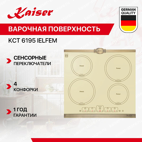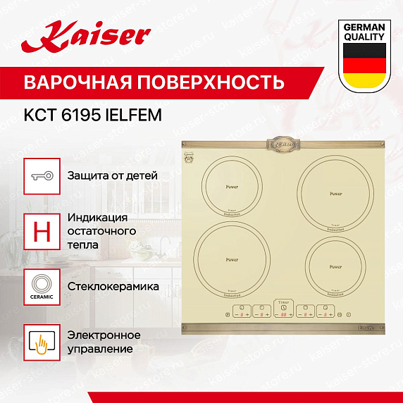 Варочная панель Kaiser KCT 6195 IELFEM — это произведение немецкой инженерной мысли, сочетающее в себе элегантный дизайн и передовые технологии. С первого взгляда бросается в глаза изысканный цвет слоновой кости, который придает модели неповторимый и в то же время универсальный вид. Этот оттенок идеально вписывается в любой интерьер, будь то классический или современный.